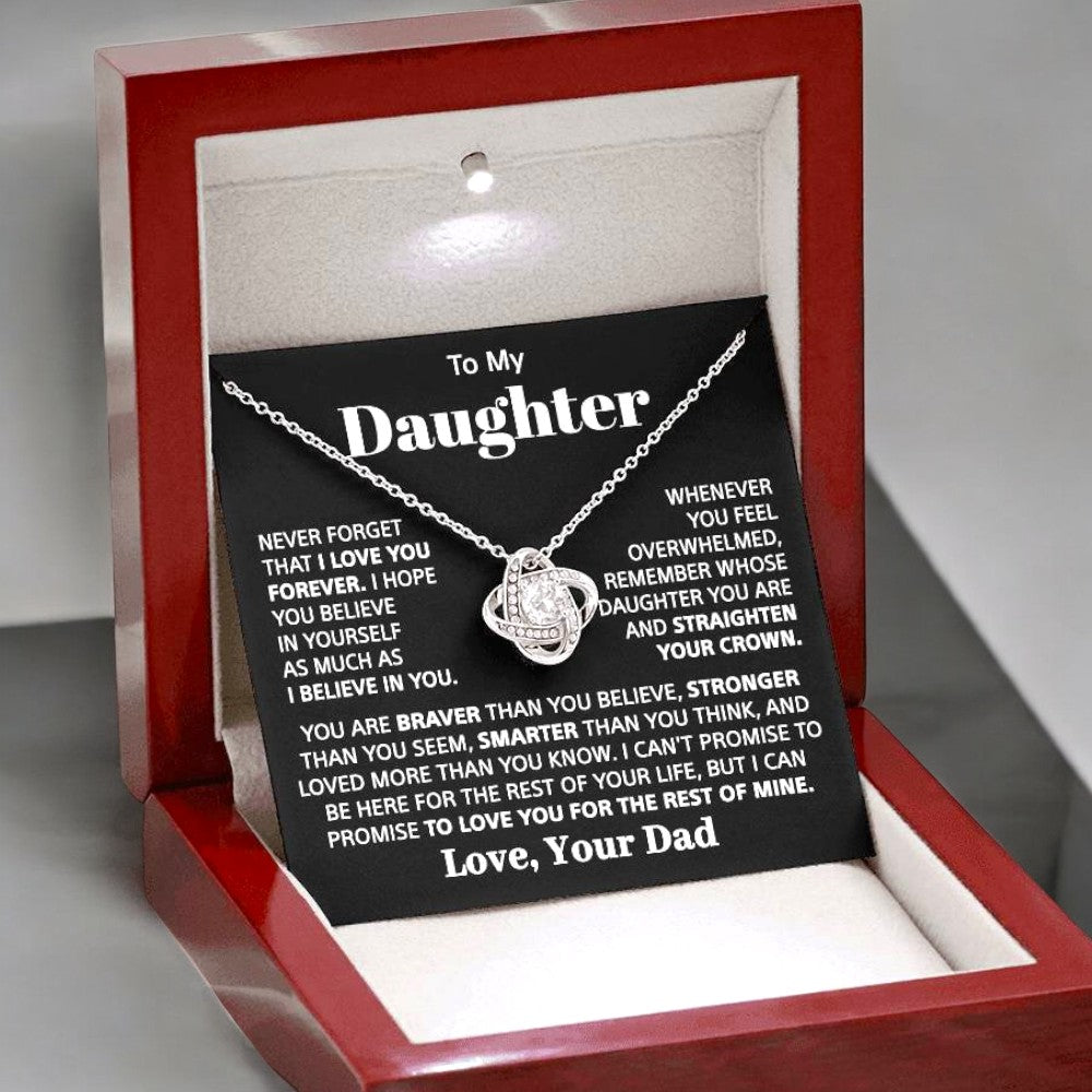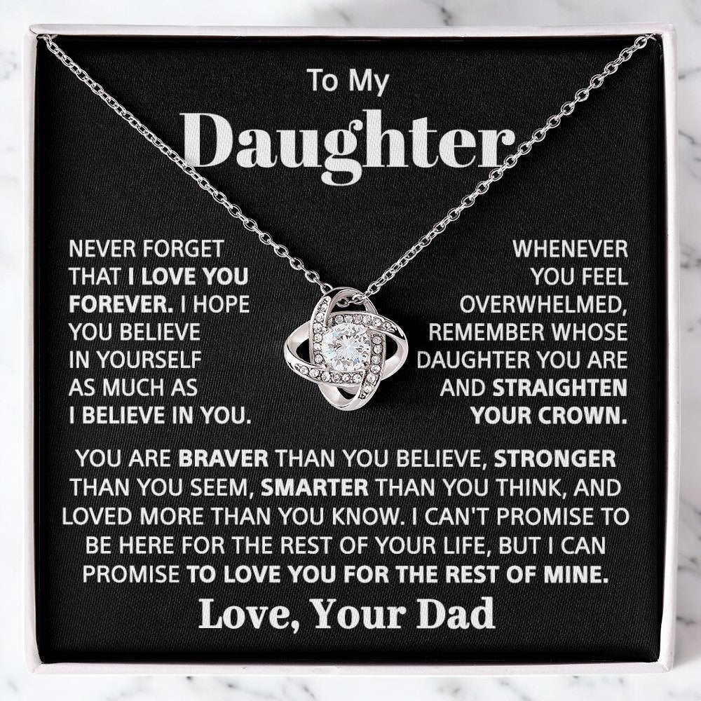 Never forget that I love you forever, and whenever you feel overwhelmed, I hope you believe in yourself as much as I believe in you. Whenever you feel overwhelmed, remember whose daughter you are and straighten your crown. You are braver than you believe, stronger than you seem, smarter than you think, and loved more than you know. I can't promise to be here for the rest of your life, but I can promise to love you for the rest of mine.